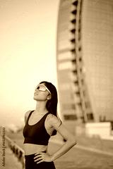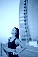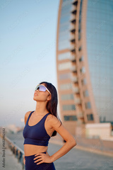 Young woman wearing sportswear and sunglasses resting after exercising outdoors in Dubai Marina with Cayan Tower in background