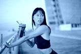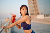 Asian sportswoman stretching her arms and holding a water bottle while taking a break from her workout in the city during sunset