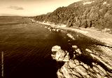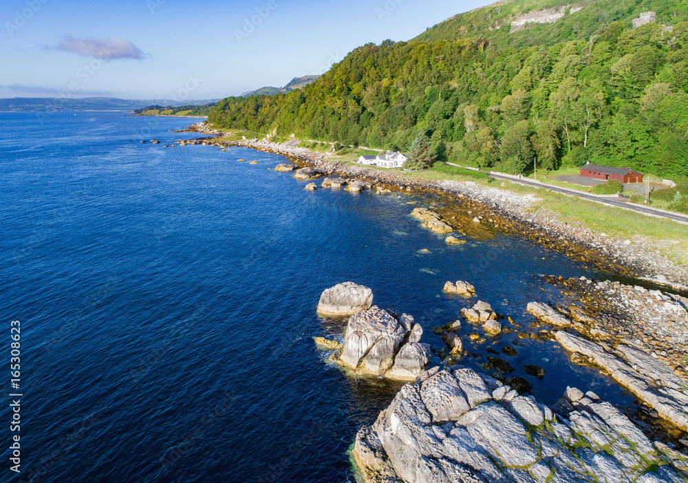 The eastern coast of Northern Ireland and Antrim Coastal Road, a.k.a. Causeway Coastal Route. Aerial view at sunrise