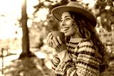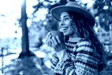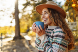 Portrait of woman in hat with cup of hot tea from thermos sitting on bench in autumn park. Beautiful female traveler enjoying hot drink on sunny day. Rest and relaxation concept.