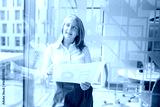 Businesswoman reviewing documents in a modern office setting while leading a team meeting