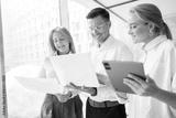 Collaborative brainstorming in a modern office with professionals engaging in teamwork and technology