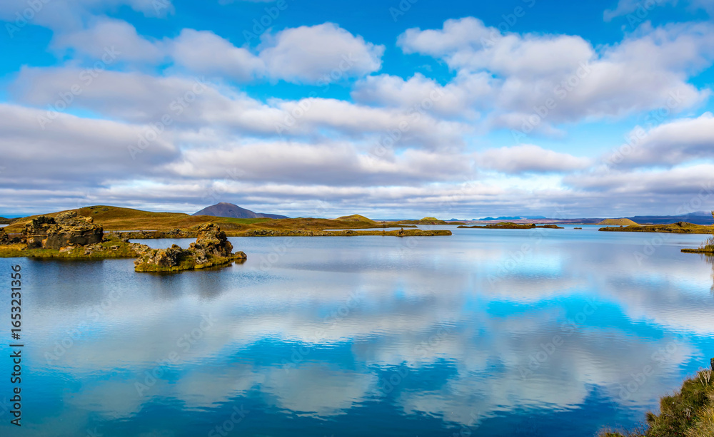 Amazing sunny day on lake Myvatn, Iceland, Europe. Beautiful clouds reflected in the blue water of a volcanic lake. Artistic picture. Beauty world. Travel concept. Panorama