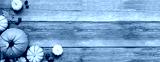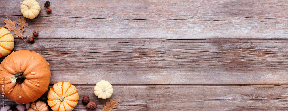 Fall corner border of muted tone pumpkins and natural decor. Overhead view on a rustic wood banner background with copy space.