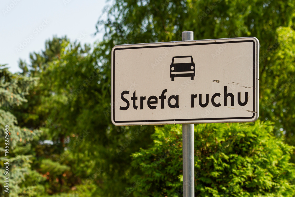Znak drogowy Strefy Ruchu Drogowego w Polsce z symbolem samochodu na zewnątrz | Polish Traffic Zone Road Sign with Car Symbol Outdoors