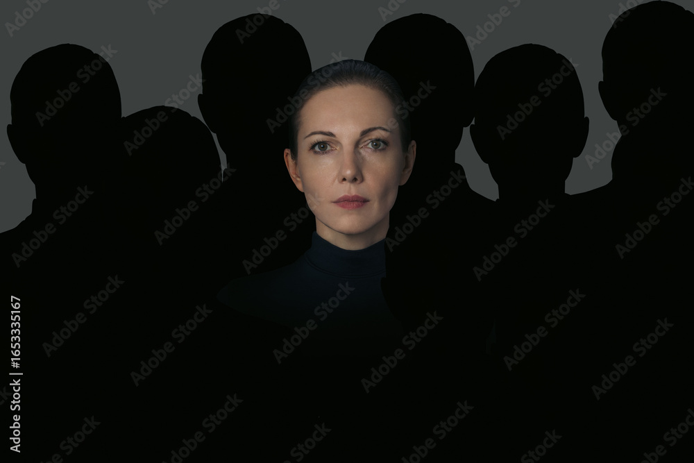 A confident professional woman stands out from a group of anonymous, silhouetted people, leadership, individuality, and a unique vision in the modern business world.