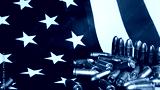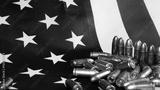 Bullets on the Flag of the United States. American shooting sport. Soldier and army weapons. Blue and red stripes with stars flag.