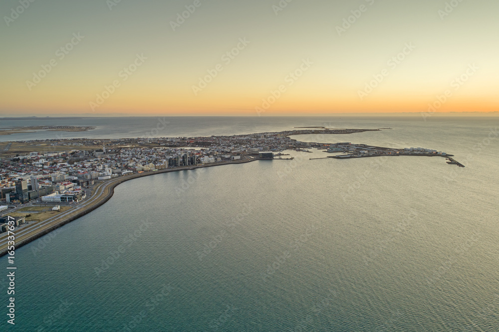 Aerial image of Reykjavik during sunset