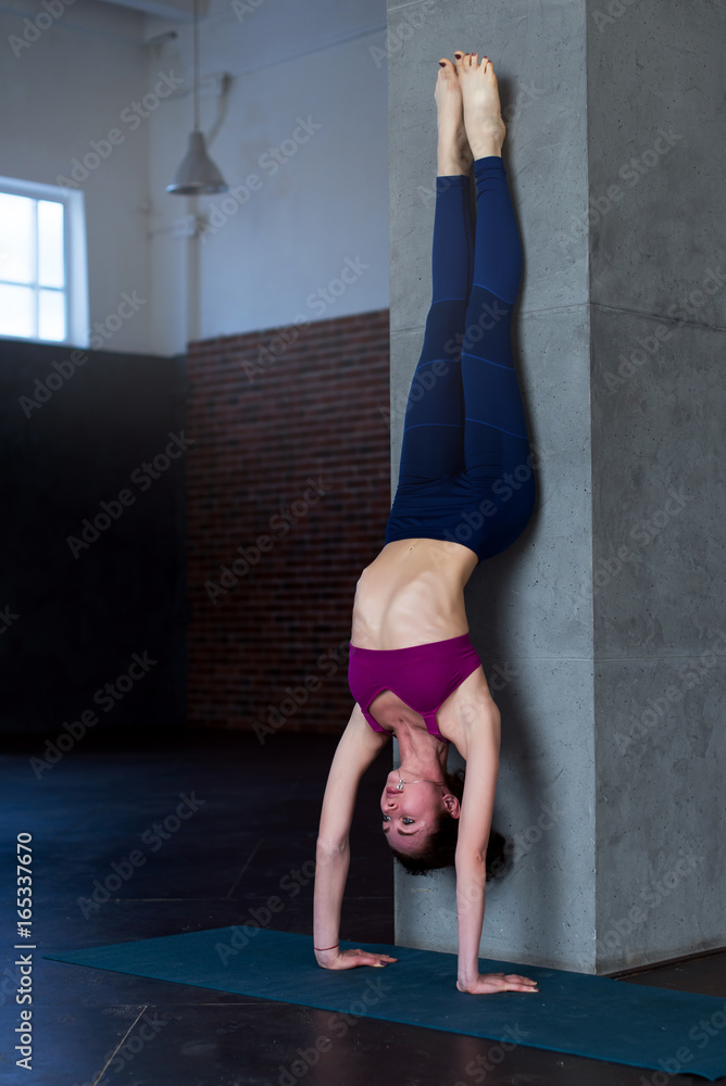 Slender young woman standing in inverted yoga pose performing handstand near the wall in sports studio