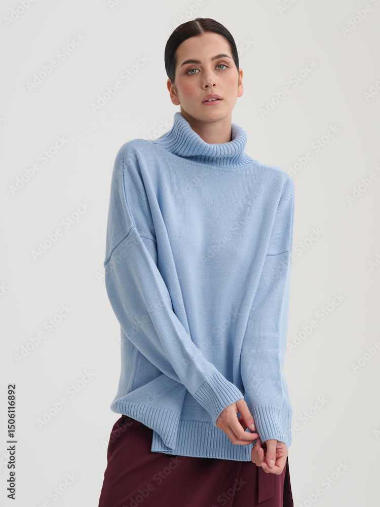Sporty Caucasian girl doing side plank star exercise working abs and oblique muscles indoors against brick wall