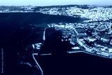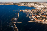 Aerial view of Chania, Crete, showcasing the Venetian harbor, docked boats, red tiled roofs, light colored buildings, and distant mountains.