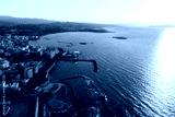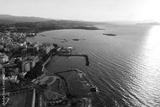 Aerial view of Chania, Crete, showing urban areas, a harbor, and a pier. The Mediterranean glistens under sunset light with islands in the distance.