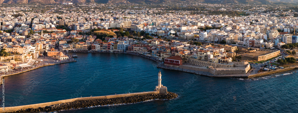Aerial view of Chania, Crete, featuring the Venetian Harbor, iconic lighthouse, colorful buildings, and a mountain backdrop by the calm blue sea.