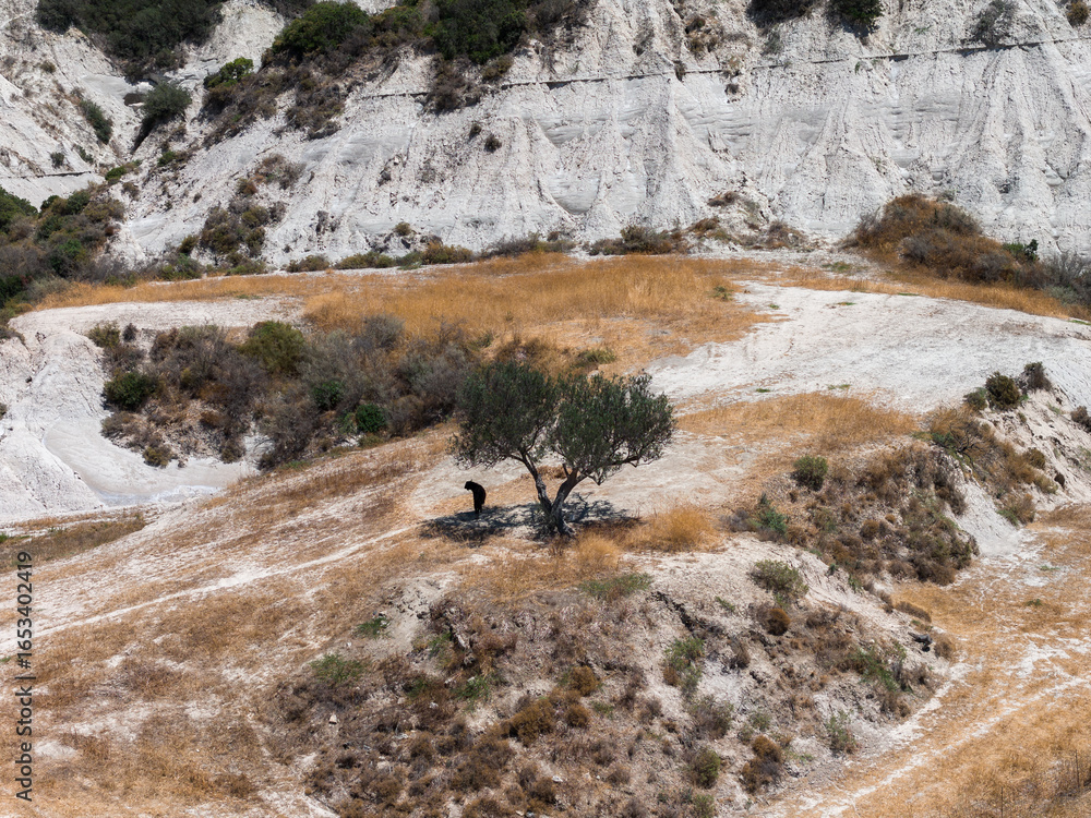 Eroded white rock formations with conical shapes in Potamida, Crete, surrounded by dry grass, sparse vegetation, and a solitary tree in the foreground.