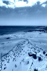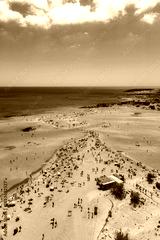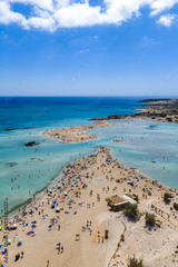 Aerial view of Elafonisi Beach in Crete, Greece, showing a sandbar, turquoise waters, visitors with umbrellas, and a rugged coastline under a blue sky.