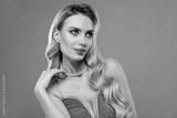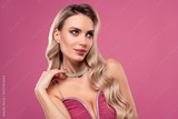 Portrait of a fashionable young woman with elegant hairstyle and jewelry on a pink background for holiday or event.
