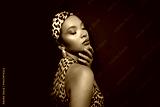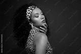 Attractive young woman posing with confidence in leopard print outfit and matching headband against red background