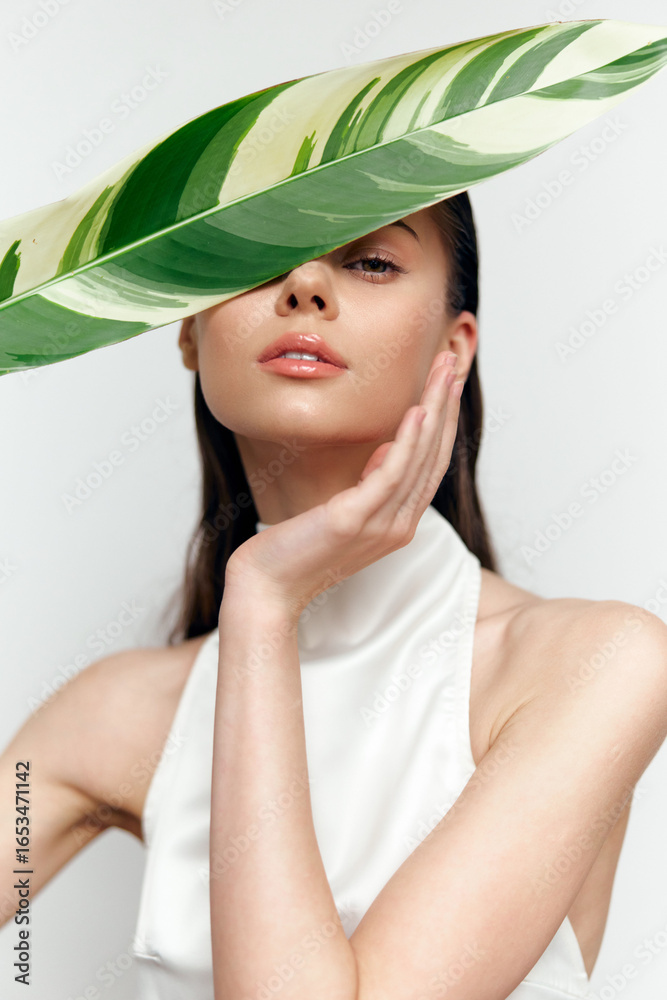 Elegant woman with palm leaf covering her face, showcasing beauty and serenity in a minimalistic studio setting, conveying a fresh and tropical vibe.