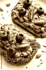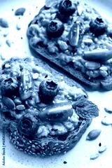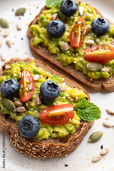 Avocado toast with blueberries, tomatoes, sunflower seeds, pumpkin seeds and sesame seeds, Healthy eating