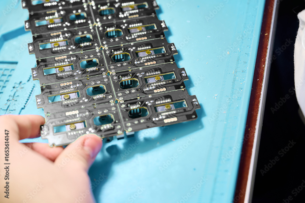 Hand assembling circuit boards in a workshop, showcasing precision and craftsmanship in electronics manufacturing