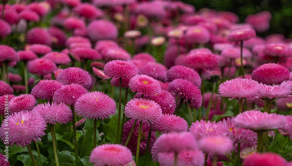 There is a lot of perennial daisy pomponette in the park on a summer day.