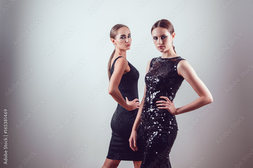 Two beautiful women in black night fashion dress posing on a gray background.
