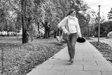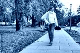 Beautiful mature woman walking in city park on autumn day. Front view