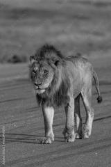 A male lion walking on a tarred airstrip in beautiful golden morning light Greater Kruger.