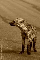 A cute spotted hyena cub standing in the tar road in Kruger National Park.