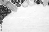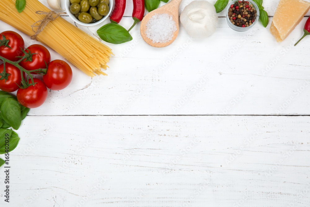 Spaghetti Zutaten kochen Pasta Italien Holzbrett Essen Nudeln Textfreiraum von oben