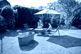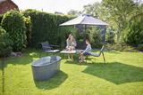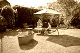 Woman and a kid cooking and eating inthe backyard