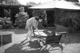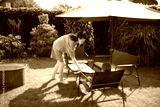 Woman and a kid cooking and eating inthe backyard
