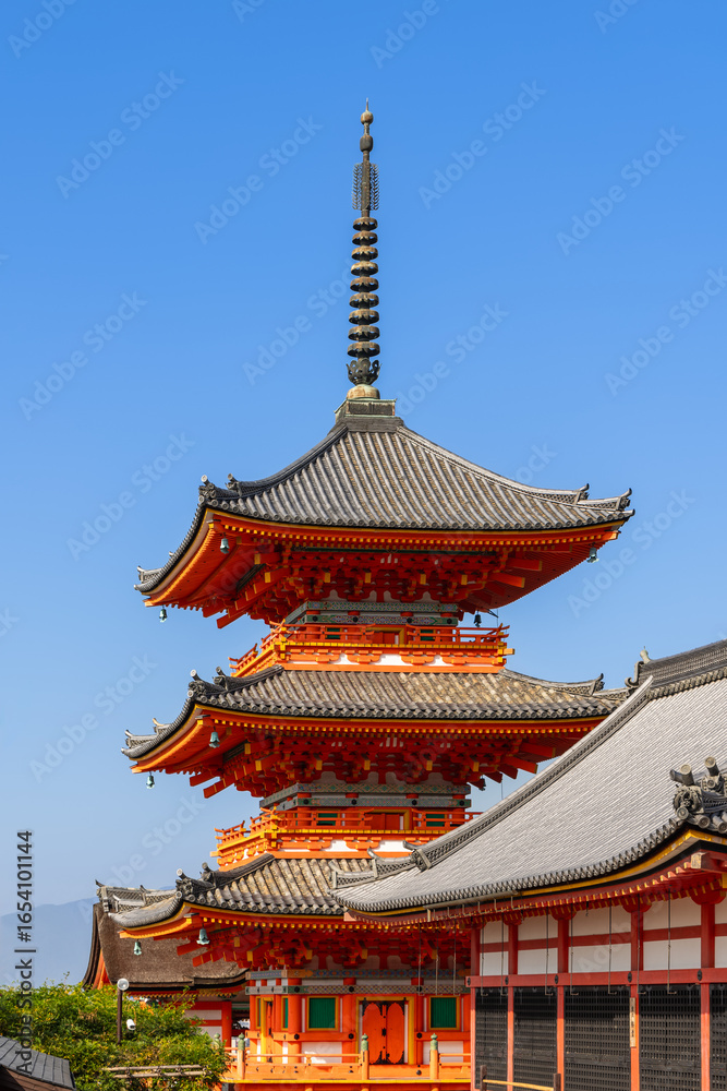 Three-tier Sanjunoto Pagoda at Kiyomizu-dera in Kyoto, Japan, with curved tiled roofs and vivid red structure under bright blue sky in direct sunlight