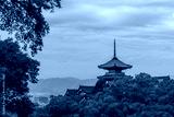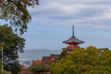 Traditional Kiyomizudera Koyasunoto Pagoda in Kyoto, Japan, seen through colorful autumn foliage with cityscape and mountains in the background