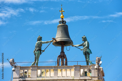 Ancient Clock Tower with bell in San Marco square, Venice, Italy