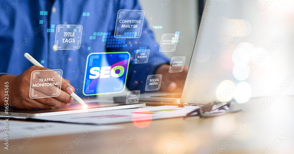 Website admins using SEO tools to get their websites ranked in top search rankings in search engine. Website improvement concept to make search results higher.