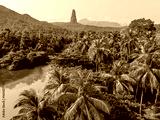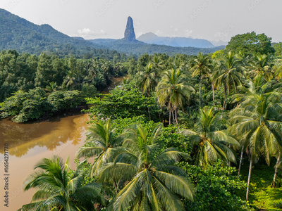 Sao Tome and Principe - Aerial View of Pico Cao Grande. Iconic Volcanic Needle Rising Above Lush Tropical Rainforest. View From Praia Grande.