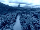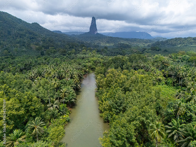 Sao Tome and Principe - Aerial View of Pico Cao Grande. Iconic Volcanic Needle Rising Above Lush Tropical Rainforest. View From Praia Grande.