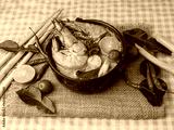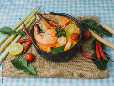 Thai soup Tom Yam Kung or Tom Yum with mushrooms and shrimp. Tom Yum Goong spicy soup traditional food cuisine.