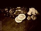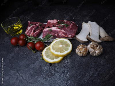Fresh Meat steak with ingredients ,garlic and lemon slices,shiitake mushroom,onion, tomatoes, rosemary prepare to be cooked on black background with copy space