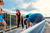 Smiling group of people are preparing for running together talking and stretching on outdoor road.