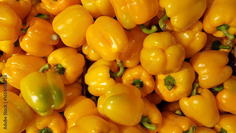Yellow sweet peppers. A yellow bell bulgarian pepper. Yellow Bell Peppers at the farmers market. Cooking raw material. Natural food background.