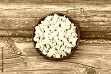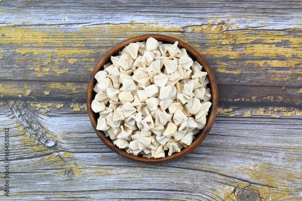 handmade manti (turkish ravioli type dumplings) on wooden bowl, before cooking