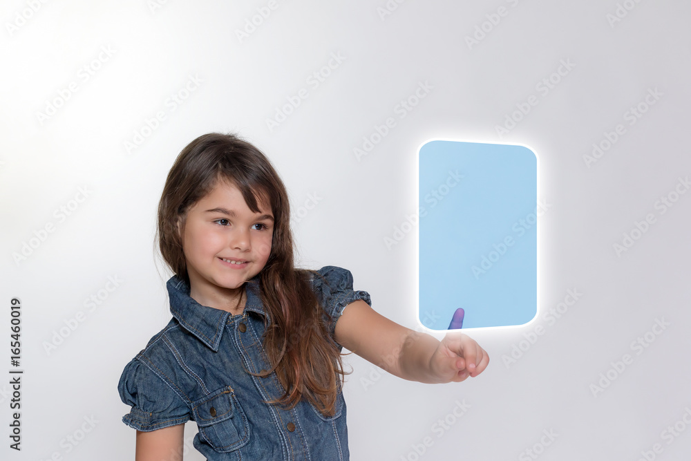 Smiling little girl is touching transparent rectangle by her index finger
