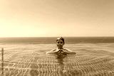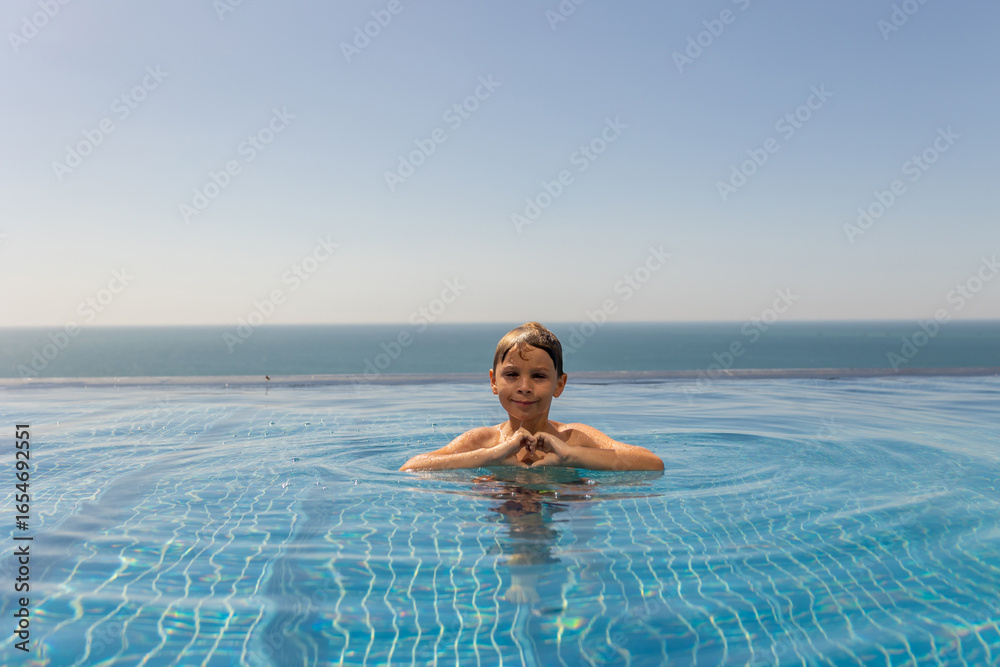 Child with mother in swimming pool, enjoying hppy family summer vacation on the beach and in resort