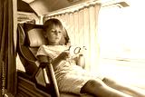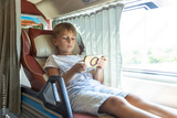 Child, boy, traveling in a sleeper bus in Vietnam, bed seat in the bus, kid on vacation summer