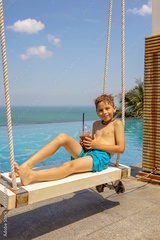 Child with mother in swimming pool, enjoying hppy family summer vacation on the beach and in resort