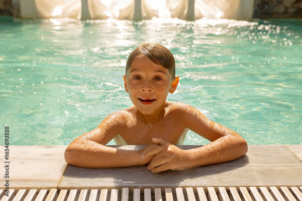 Child with mother in swimming pool, enjoying hppy family summer vacation on the beach and in resort
