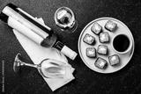 Blue sushi rolls and blue wine chardonnay on black background. Spanish blue wine, trendy drink, Fancy wine, top view. Copy space