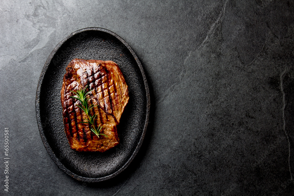 Grilled beef steak on black cast iron plate. Background with copy space. Barbecue, bbq meat beef tenderloin. Top view, slate background
